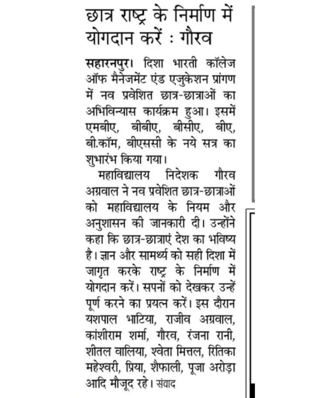 Press Release of Orientation program organized in Disha Bharti College to welcome new students in Various Courses.