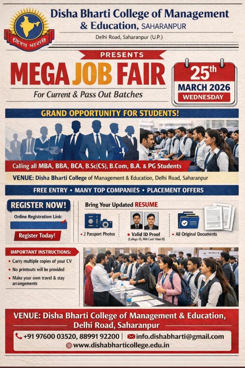 An invitation to Job Fair in Disha Bharti College on 25th March 2026.